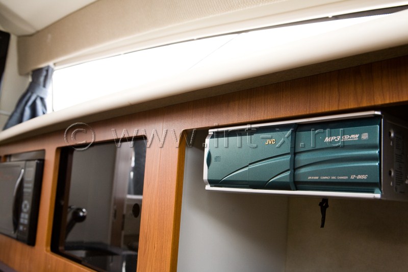Вторая система расположена в каюте и устроена несколько проще той, что работает на палубе. Коль скоро проводить дискотеки в недрах яхты никто не планировал, тут оказалось достаточно разместить пару компонентных комплектов - Morel и DLS. Кстати, здесь же, внизу, можно обнаружить корпус, в котором покоятся усилители, работающие на акустические системы палубы. Что до динамиков нижней зоны, то им, по мнению установщиков, запредельная мощность ни к чему, так что все Могеl здесь работают непосредственно от встроенного усилителя головного устройства. Центром радости и источником наслаждений в каюте стал DVD-ресивер JVC, работающий в паре с чейнджером этого же бренда. Поскольку это помещение предназначено для расслабленного и относительно тихого времяпрепровождения, а без визуального сопровождения современный человек этого не мыслит, видеосигнал с головного устройства вывели на телевизор.